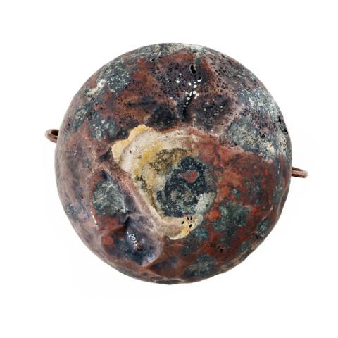 Objeto para cocer alimentos. Simétrico, con cuerpo cónico, cuello de forma ovoide, de perfil compuesto, base cóncava. Tiene dos placas laterales de donde salen dos asas de emplazamiento cuello-cuerpo. De metal color marrón cobrizo, negro y verde.