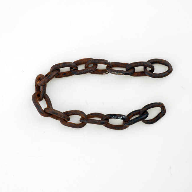 Objeto oblongo formado de una serie de quince eslabones irregulares enlazados entre sí. De metal color marrón oscuro y salmón.