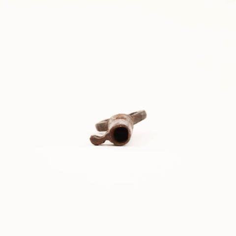 Objeto que se usa para abrir o cerrar una puerta. De pequeño formato, cuerpo ligeramente cónico, con dos pestañas en la punta y cabeza elíptica. De metal color marrón rojizo y negro.