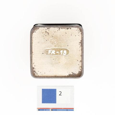 Objeto que sirve para contener y comercializar té. Fabricado en latón de color negro, verde, rojo, celeste dorado y azul. Compuesto por un cuerpo, con forma de paralelepípedo cuadrangular, dividido en dos secciones: receptáculo y tapa, unidos entre sí por una bisagra posterior. En la parte superior de la tapa y en tres de sus caras tiene la imagen de un paisaje inscrito en un círculo con tres figuras humanas. En los costados tiene letras impresas.