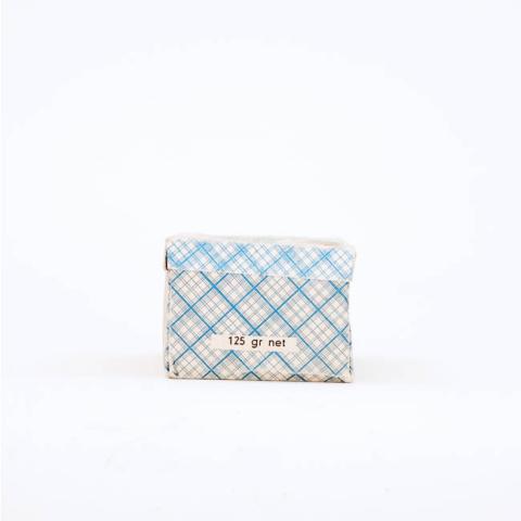 Contenedor que sirve para comercializar almidón. Fabricado en cartón, compuesto por un cuerpo con forma de paralelepípedo rectangular, dividido en dos secciones: receptáculo y tapa superior que se encaja. En la parte superior de la tapa tiene dos imágenes, la del un paisaje urbano y un gato, ambas de color negro sobre fondo verde y rojo respectivamente, y letras impresas. En las caras laterales presenta un tramado lineal de color celeste. Y en la cara frontal y lateral la imagen de dos gatos blanco sobre fondo verde. El objeto se encuentra sellado por etiquetas de papel.