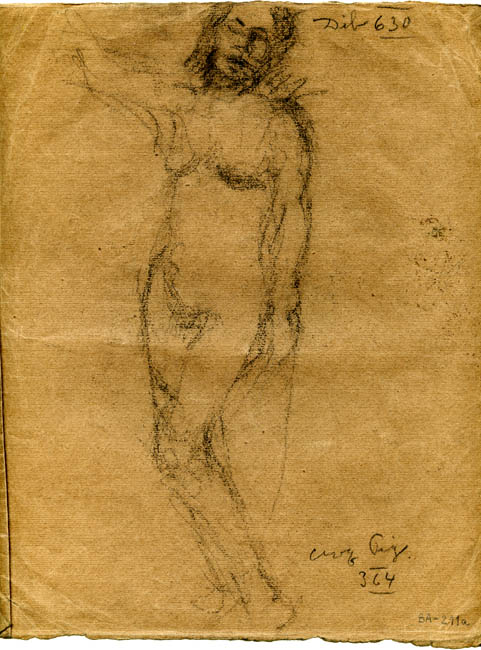 Composición en base a una figura femenina desnuda de frente y de pie, con el brazo izquierdo flectado, apoyado en la cabeza y la pierna derecha levemente doblada. Al costado derecho, el esbozo de una mano.