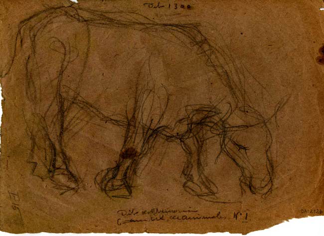 Composición en base a figuras de animales. Presenta la figura de un vacuno de perfil con la cabeza inclinada hacia abajo.