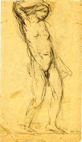 Composición en base a una figura masculina central, desnuda, de pie y de medio perfil derecho con el brazo derecho doblado y apoyado sobre la cabeza.