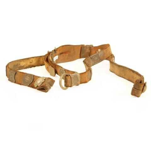 Objeto usado como rienda. Compuesto por una tira larga y angosta de cuero color marrón con una hebilla y pasador metálico. Ésta se bifurca en dos tiras menores a cada lado, con aplicaciones metálicas color plateado con decoración de figuras florales. Una de las correas tiene una hebilla y pasador, y dos tienen remaches con figura floral en su extremo. Reverso liso de color marrón claro.