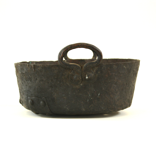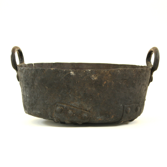 Compuesto por un cuerpo de forma tronco-cónico y base plana. Posee dos asas laterales elípticas sujetas por dos remaches cada una. En la base tiene ocho placas remachadas. Fabricado en metal color marrón oscuro, cobrizo y verde.