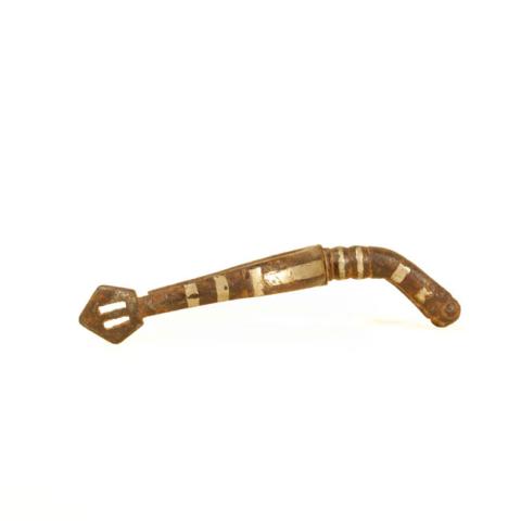 Compuesto por un arco laminar de hierro color rojizo con dos perforaciones en un extremo. Presenta una pieza de sección cilíndrica abierta y terminada en dos remaches. Decoración con franjas metálicas color plateado.