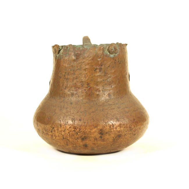Objeto compuesto por un cuerpo simétrico, de forma ovoide, cuello cilíndrico, borde recto y base convexa. Tiene una placa de refuerzo lateral, de donde se forma un asa de emplazamiento cuello-cuerpo. Presenta cuatro remaches alrededor del labio. Fabricado en metal color marrón cobrizo y verde.