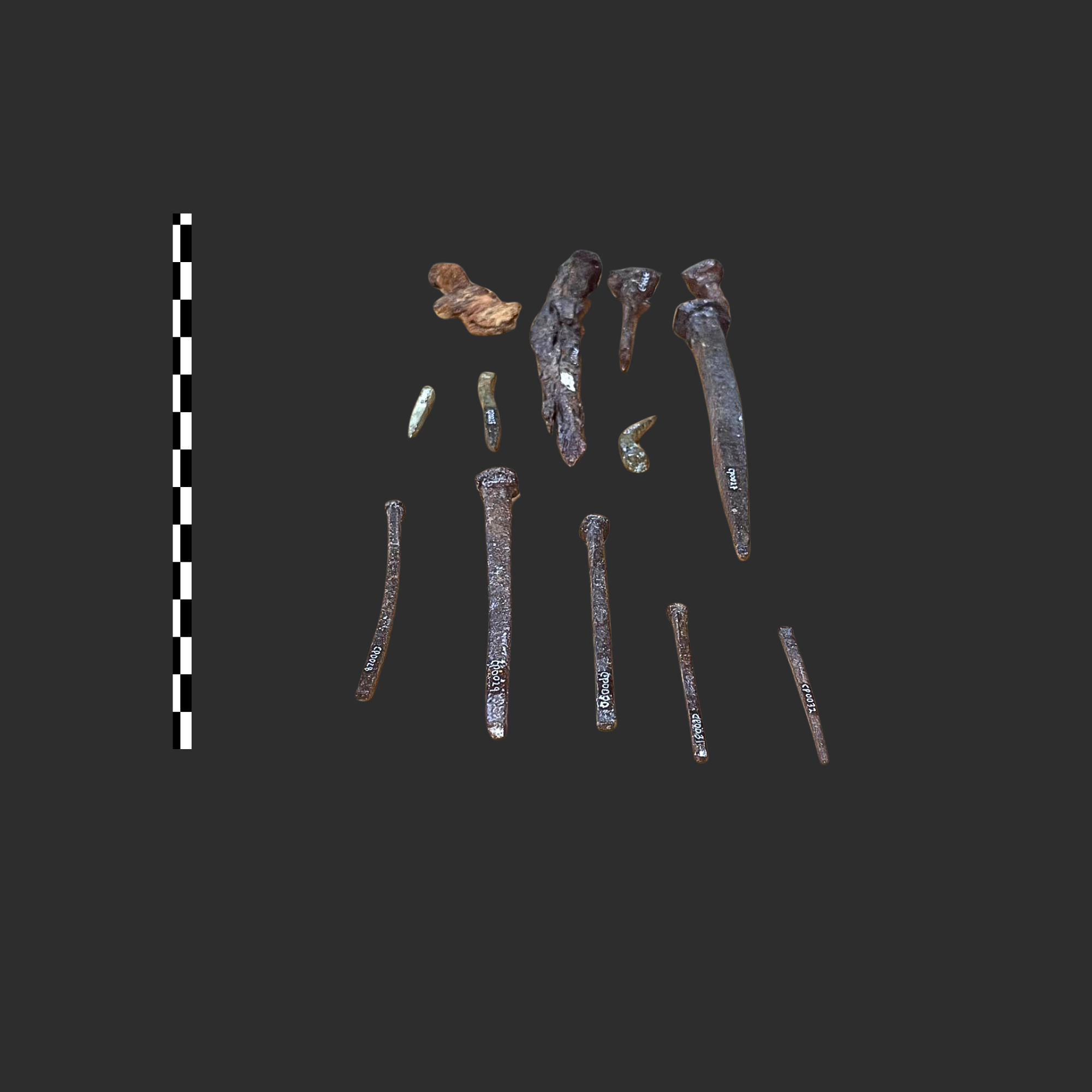Conjunto de 13 clavos de hierro forjado de diferentes tamaños y formas, utilizados en la construcción de estructuras interiores del Castillo de Niebla. Los clavos presentan una notable oxidación, con tonos marrón rojizo, y algunas deformaciones. La mayoría de las piezas tienen un cuerpo alargado y cabezas ligeramente aplanadas, características de los elementos de fijación manualmente fabricados por herreros de época colonial. Los diferentes tamaños indican que fueron diseñados para una variedad de usos estructurales, desde la fijación de elementos pequeños hasta la unión de vigas y maderas más grandes. Este conjunto refleja el uso de materiales locales y técnicas tradicionales en la arquitectura militar colonial.