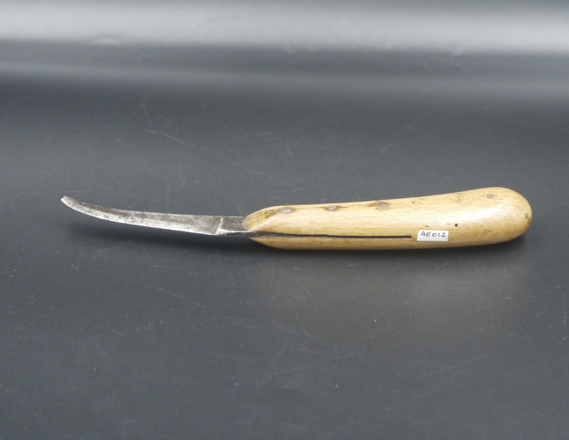 Objeto utilizado para cortar. Se compone de una hoja metálica plateada y ondulada hacia el extremo, con uno de sus bordes afilados y terminando en punta. La hoja se inserta en un mago de madera marrón claro, en la que se observan las cabezas de tres clavos metálicos de color plateado.