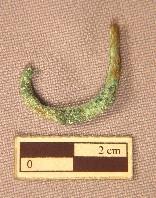 Objeto de forma alargada y curva, de cuerpo irregular. Color verde oscuro y marrón, con manchas de óxido verde.