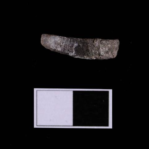 Objeto de forma alargada y curva, de cuerpo irregular. Color marrón oscuro y marrón, con manchas de óxido verde. Está elaborado en metal laminado.