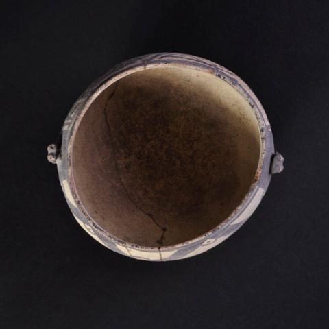 Ceramio de forma globular semirestringido; engobe de color blanco interno y externo; posee dos adiciones mamelonares de forma indefinida en el cuerpo. Superficie pintada exterior con decoraciones en motovos geométricos, lineales, triangulares y escalerados.