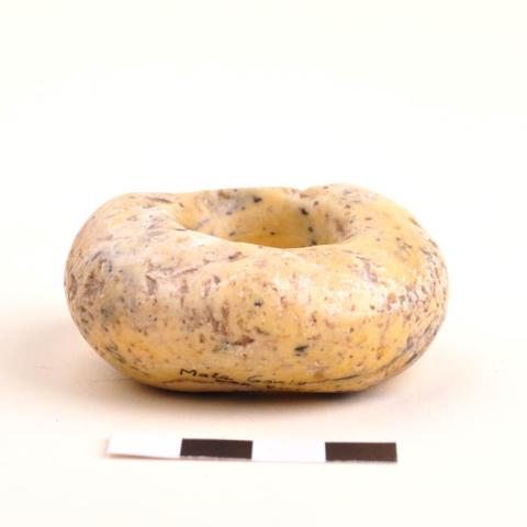 de forma cilíndrica con horadación vertical en el centro, de color marfil y amarillo con vetas de color gris. Superficie pulida.