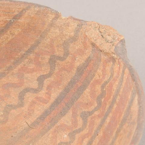 Contenedor abierto de perfil simple. Tiene borde redondeado y cuerpo semiesférico de base curva. Presenta dos asas mamelonares de pequeño tamaño contrapuestas en el labio. De color marrón claro, la superficie está alisada, pulida y engobada y el interior está decorado con una ancha banda de líneas rectas y onduladas de colores rojo y negro alternadas.