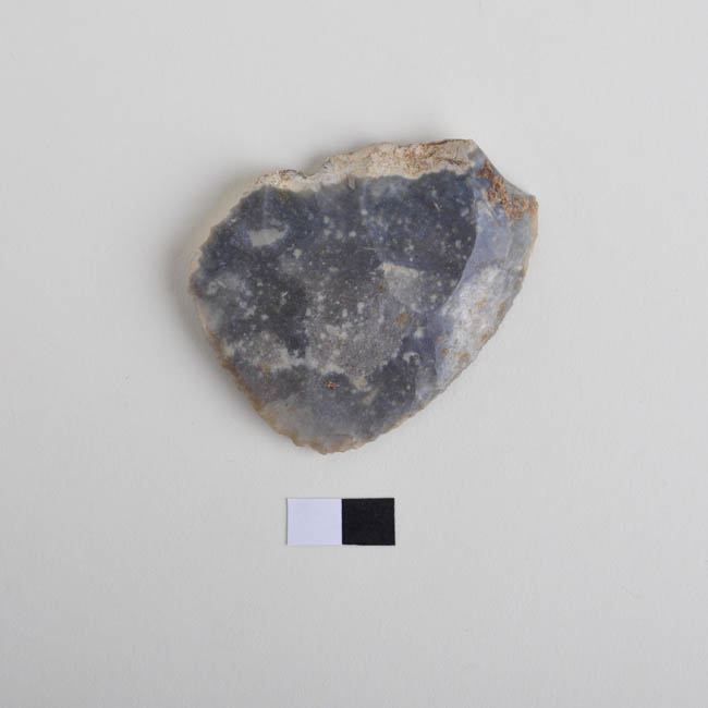 Instrumento lítico usado para cortar. Objeto de forma triangular irregular, de sección plana y bordes redondeados. Está fabricado en piedra de talla bifacial rústica, de color gris claro.