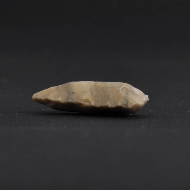 Objeto de forma triangular, de talla bifacial con retoque bimarginal de base escotada. Color gris claro.