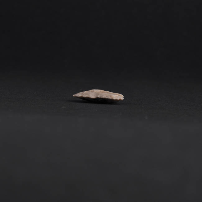 Objeto de forma triangular, de talla bifacial con retoque bimarginal, con bordes dentados; base ligeramente curva. Color gris claro y blanco.