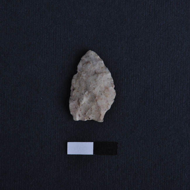 Descripción Física: Objeto de forma triangular, de talla bifacial con retoque marginal; base plana y fragmentada. Color gris claro.