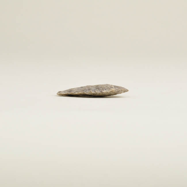 Objeto de forma ovalada, punta fragmentada; talla bifacial, retoque bimarginal. Color gris claro con manchas beige.