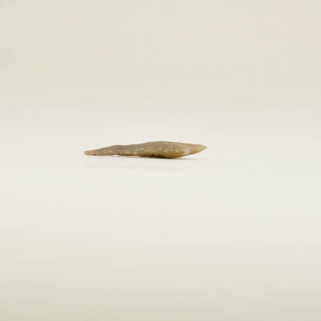 Objeto de forma triangular, base apuntada, pedunculada; talla bifacial, retoque bimarginal. Color gris.