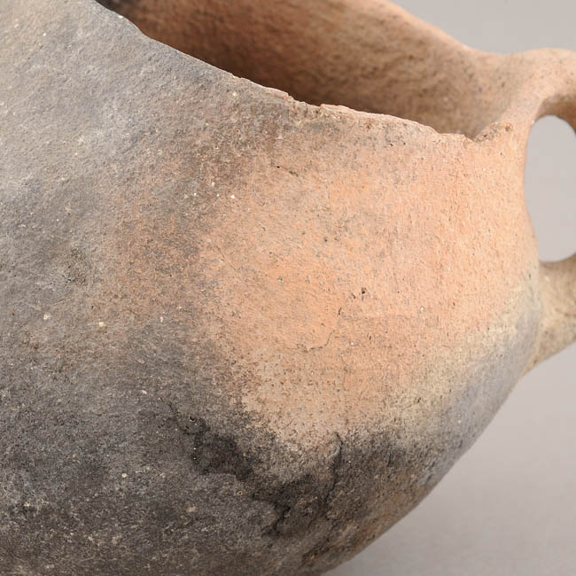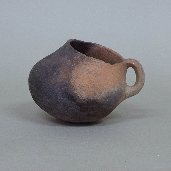 Contenedor restringido de perfil compuesto. Tiene labio redondeado, cuerpo elipsoide de base curva. Posee un asa anular de orientación vertical de borde a cuerpo. Superficie alisada de color anaranjado con manchas negras.