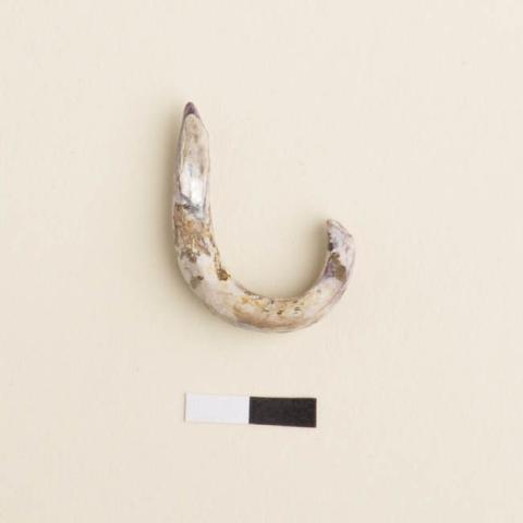 Instrumento para pescar inacabado. Objeto de forma alargada curva, con un vástago recto terminado en punta. Está fabricado en valva de molusco de color morado, gris y nácar.