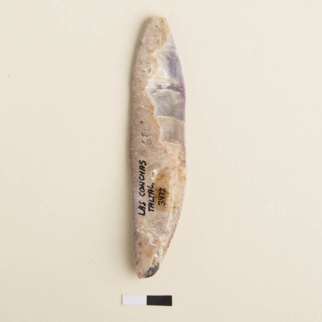 Instrumento usado en faenas de pesca. Objeto de forma alargada de sección plana con ambos extremos romos. Está fabricado en valva de molusco tallado y pulido de color gris claro y rosado.