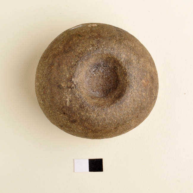 Instrumento lítico. Objeto de forma cilíndrica de bordes redondeados con horadación bicónica incompleta. Está fabricado en piedra tallada y pulida de color marrón oscuro. Superficie porosa.