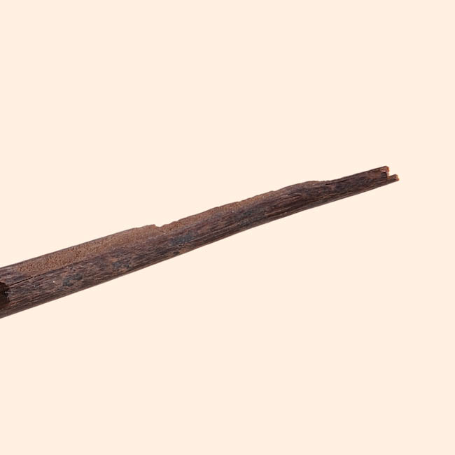 Objeto de forma cilíndrica alargada con ambos extremos aguzados; posee una superficie pulida de color marrón.