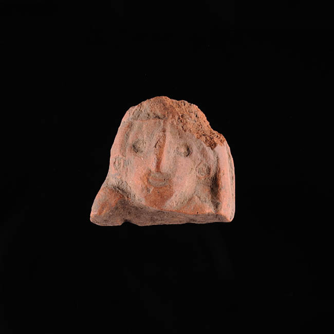 Objeto de forma alargada irregular. Modelado en relieve de rostro humano de rasgos marcados. La parte posterior es plana y se encuentra fragmentado en el cuello y en la parte superior, lo cual hace imposible discernir su forma completa. De color marrón rojizo y superficie lisa.