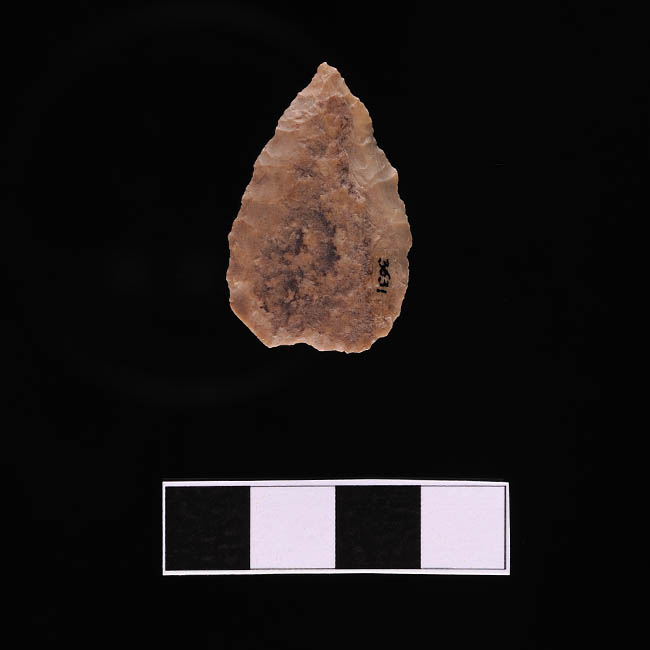 Objeto de forma triangular redondeada de base escotada. Talla monofacial con retoque marginal sencillo. Color beige.