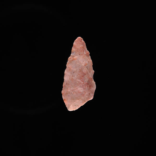 Objeto de forma lanceolada con base fragmentada. Talla bifacial continua con retoque marginal simple. Color rosado con vetas rojo claro.