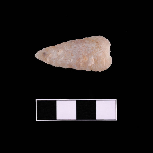 Objeto de forma triangular y base escotada. Talla bifacial con retoque bimarginal. Color gris claro traslúcido.