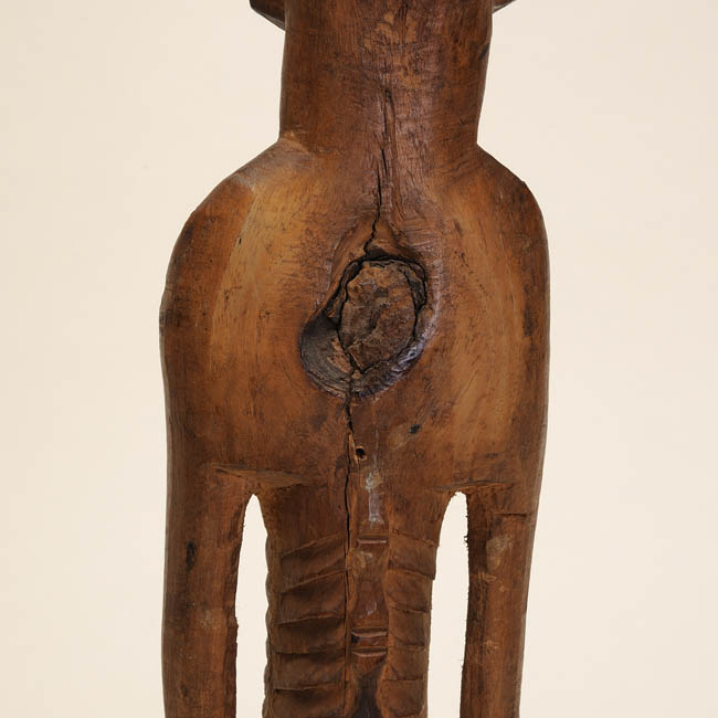 Escultura de bulto. Objeto de forma alargada semi curva sin base. Figura antropomorfa de cabeza calva, orejas largas, ojos perforados con material blanco y negro, posee un contorno de los mismos sobresaliente y decorado con lineal inciso vertical. Nariz prominente, de arco quebrado, Boca abierta con comisuras que suben hacia la mejilla y dientes visibles en forma de zig-zag. Posee una perilla conformada por un promontorio. Espalda curva con vértebras marcadas en inciso lineal horizontal, costillas prominentes y talladas en forma lineal. Posee brazos en línea con el cuerpo, manos pegadas a caderas con dedos extendidos incisas verticales para conformar los dedos. Piernas gruesas extendidas y pies pequeños y planos sin detalles. Superficie lisa de color marrón oscuro ligeramente rojizo. Posee un nudo natural de la madera en la espalda, pero no se trata de un proceso de deterioro.