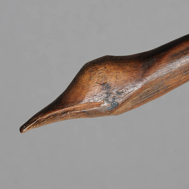 Escultura de bulto. Objeto zoomorfo, alargado y sinuoso y con ambos extremos aguzados que presenta un tallado a bisel tosco para expresar un hocico. De color marrón oscuro con vetas y superficie pulida de acabado brillante.