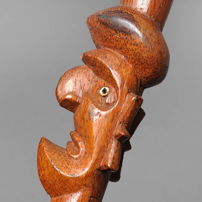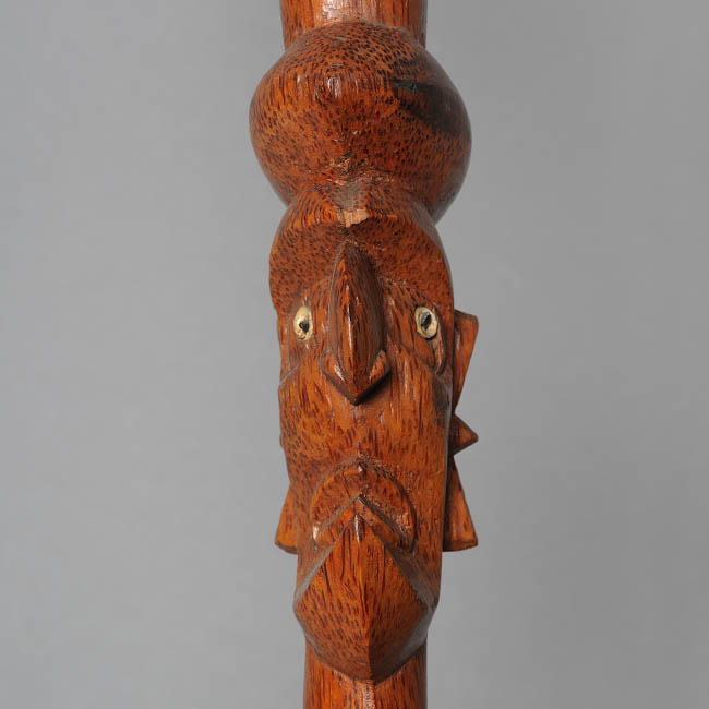 Objeto de forma alargada, de mango curvo con diseño tallado antropomorfo, de cabeza calva, orejas largas, ojos perforados recubiertos de blanco y negro, posee un contorno de los mismos sobresaliente. Nariz ausente. Boca abierta con comisuras que suben hacia la mejilla Posee una perilla conformada por un promontorio que se curva hacia arriba. Cuerpo cónico que remata en base curva. Color Marrón con vetas marcadas de color oscuro, superficie lisa.