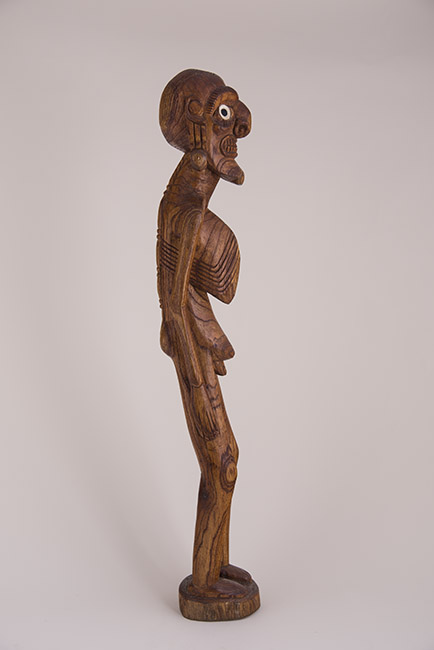 Figura exenta de forma alargada semi curva con base, antropomorfa calva, con diseños lineales, cejas marcadas, ojos abiertos realizados con incrustaciones, nariz prominente, la boca abierta con los dientes cerrados, orejas largas y mentón turgente con pequeña barba. El tórax es sobresaliente con las costillas marcadas, ambos brazos se encuentran en los costados del cuerpo y las manos extendidas con largos dedos. La espalda se encuentra levemente curvada con las vertebras marcadas, piernas y pies sin detalles.