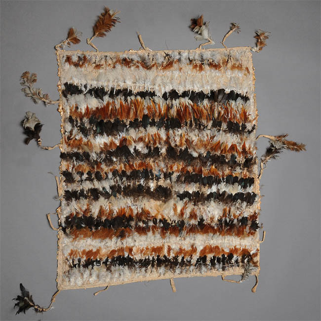 Objeto de forma rectangular, plano, compuesto por una base de fibra vegetal tejida con superficie urdida y decorada con plumas de color blanco, negro y marrón. Posee borlas (12) de plumas pendientes, unidas al borde a intervalos regulares. En la parte posterior se encuentra pintada, aparentemente con plumón, en diseños que representan dos remos ceremoniales de color rojo y negro, dos reimiro en color negro, y dos manu tara opuestos, negros también.