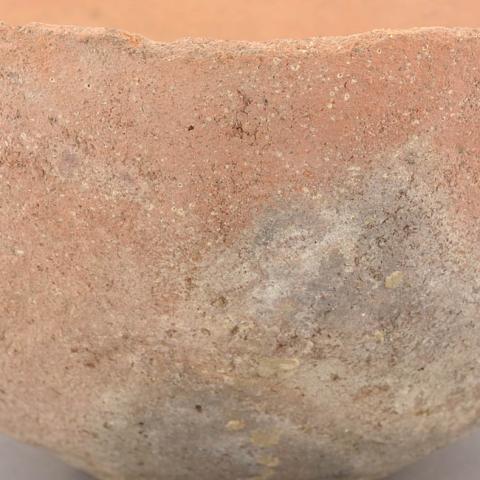 Contenedor abierto de perfil simple. Tiene labio recto, cuerpo troncocónico invertido y base plana con falso torno. Superficie alisada de color anaranjado con manchas marrón