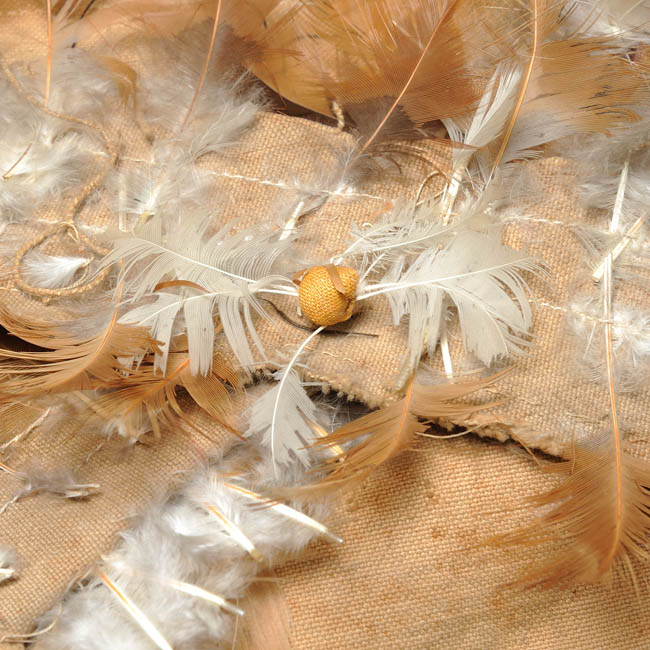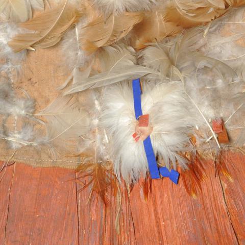Objeto de forma alargada irregular compuesto por una base de fibra vegetal de forma trapezoidal y cubierto por plumas entrelazadas, de la cual penden vástagos de fibra vegetal rematados en plumas. De colores blanco, anaranjado, gris, beige y negro