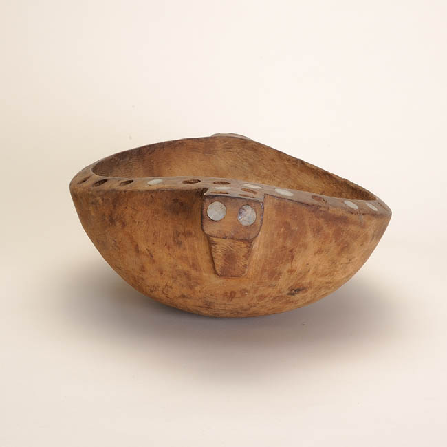 Objeto de forma oblonga, cóncavo, más aguzado en uno de sus extremos, con reborde más ancho, decorado con incrustaciones cilíndricas de nácar blanco. De color marrón.