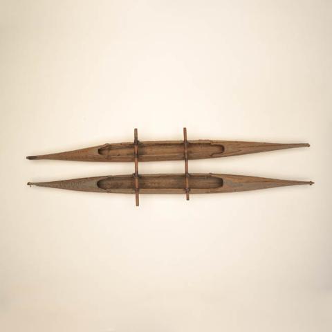 Objeto de forma alargada compuesto por dos cuerpos oblongos, cóncavos, más aguzados en sus extremos, se encuentra tallado inciso a bisel lineal en la parte superior del cuerpo y unidos con fibra vegetal y varillas de madera insertas en perforaciones. De color marrón oscuro