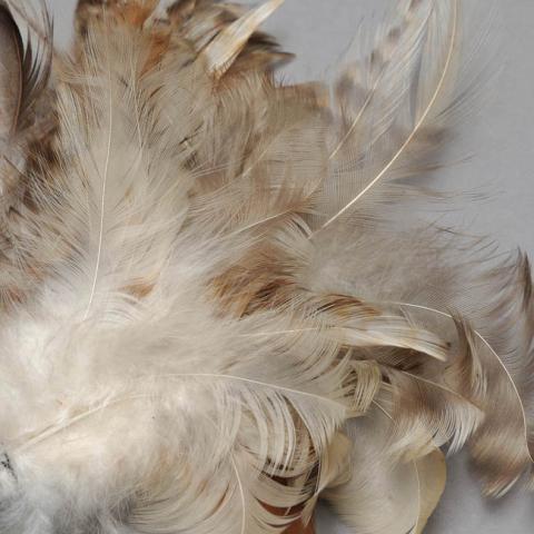 Objeto de forma alargada compuesto por un mango de madera cilíndrico que posee en la parte superior un manojo de plumas de colores gris, blanco, marrón claro y negro.