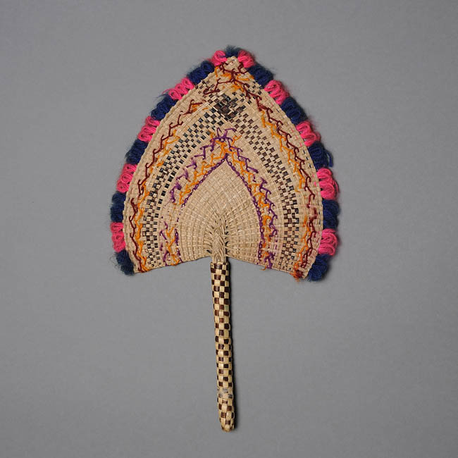Objeto de forma alargada tejido en fibra vegetal rígida. Posee un mango compuesto de fibras vegetales . La parte superior, en forma de hoja, se encuentra tejida en líneas que convergen en el mango, y decorado con bordado rústico de lanas en forma lineal de colores anaranjado, morado y rojo oscuro. Posee adornos de lana azul y magenta en los bordes.