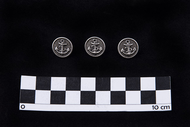 Disco plateado con diseño en sobrerelieve de un ancla con cuerda enlazada. En la parte posterior anillo central fijo perpendicularmente para sujeción.