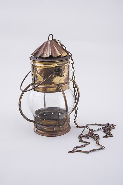 Objeto de cuerpo globular protegido por varillas metálicas dispuestas verticalmente. En la parte superior posee cilindro metálico coronado con un sombrero cónico estriado que termina en argolla desde donde se sujeta una cadena, asó como una manilla movible. La base está compuesta por una lámina cilíndrica.