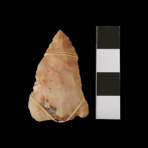 Herramienta lítica utilizada como cabeza de proyectil arrojadizo durante la caza. Tiene cuerpo triangular y base plana. Talla bifacial con retoque bimarginal sencilo. Color marrón claro con vetas oscuras.
