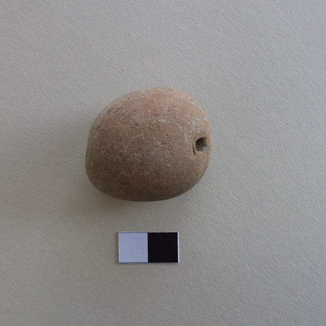 Instrumento usado en la pesca para fijar las redes. Objeto de forma ovoidal irregular con perforación bicónica en el sector central. Piedra pulida de color gris claro.