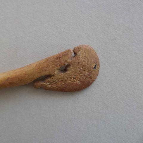 Instrumento asociado a la páctica del consumo de alucinógenos. Objeto oblongo con un receptáculo ovalado en el extremo distal y mango de sección plana con remate redondeado. Se encuentra decorado en el extremo del mango con una figura zoomorfa tallada de aspecto estilizado. Hueso tallado y pulido de color beige.